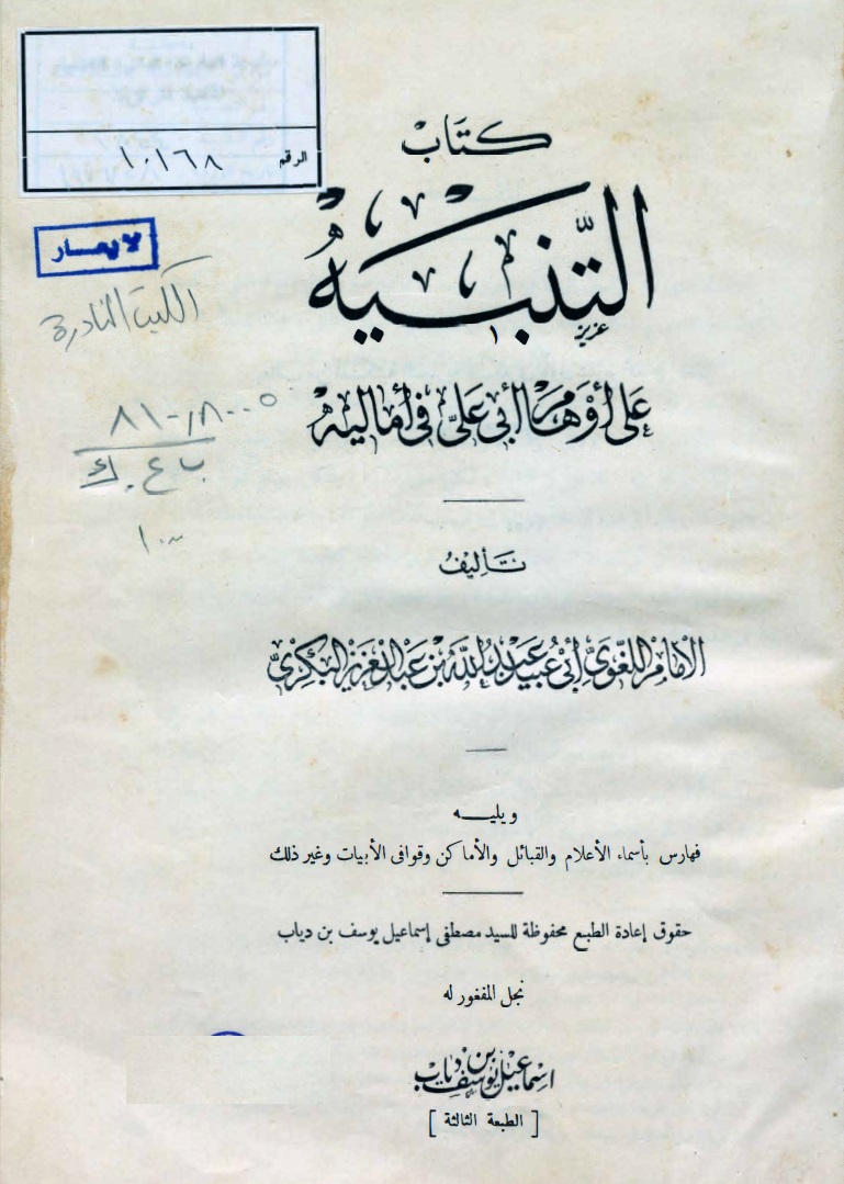 كتاب التنبيه على أوهام أبي علي في أماليه / تأليف أبي عبيد عبدالله بن عبدالعزيز البكري هو من أعيان اهل الاندلس واكابرهم سكن قرطبة, وكان متقدما من مشيخة أول البيوت وارباب النعم بالاندلس, فاصطفاه لصحبتهآثر مجالسته وكان ملوك ...